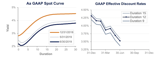 Pension liabilities (for funding, accounting, and de-risking purposes) are driven by market interest rates. The graph on the left compares our Aa GAAP spot yield curve at December 31, 2018, and June 30, 2019, and it also shows the movement in the curve last month. The graph on the right shows our estimate of movements in effective GAAP discount rates for pension obligations of various duration during 2019: