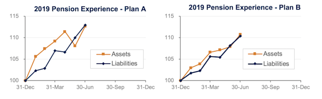 Legendary investor Yogi Berra once quipped: “It’s tough to make predictions, especially about the future.” At the beginning of the year, almost no one foresaw corporate bond yields falling 0.75% or stock markets earning 15%+ in the first half of the year, but here we are. As dramatic as these movements have been, the upshot for pensions has been basically a wash. The graphs below show the progress of assets and liabilities for our two model plans through the first half of 2019: