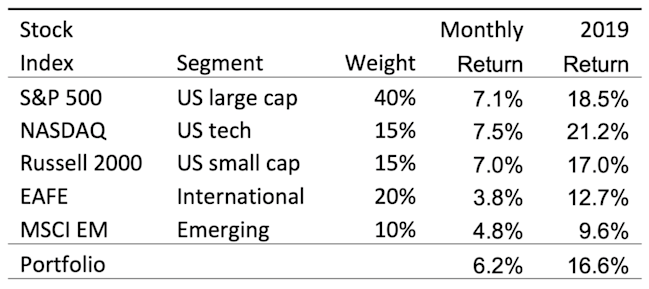 Stocks recouped most of May’s losses in June, gaining 4%-7% for the month and cementing a strong first half for 2019. The table below summarizes returns on various stock indexes included in our model portfolio: