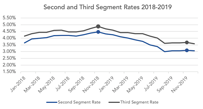 De-risking involves paying out the present value of a participant’s benefit as a lump sum. The interest rates used to calculate that present value are the Pension Protection Act (PPA) “spot” first, second and third segment rates for a designated month. Many sponsors set the lump sum rate at the beginning of the calendar year, based on the spot rates in a prior year “lookback” month, so that participants will know what rate will be used to calculate their lump sum for the entire year. A plurality of plans use a November lookback month, which we use in our example. Under such an approach, for 2020 the lump sum rates would be the November 2019 PPA spot rates.