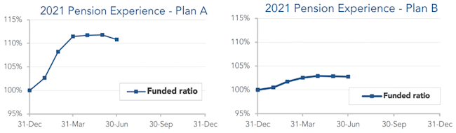 Pension finances were steady to down 1% in June due to falling interest rates, but both model plans we track[1] remain comfortably in the black for the year: Plan A dropped 1% last month but remains up more than 10% during 2021, while the more conservative Plan B was flat last month and remains up almost 3% through the first half of the year:
