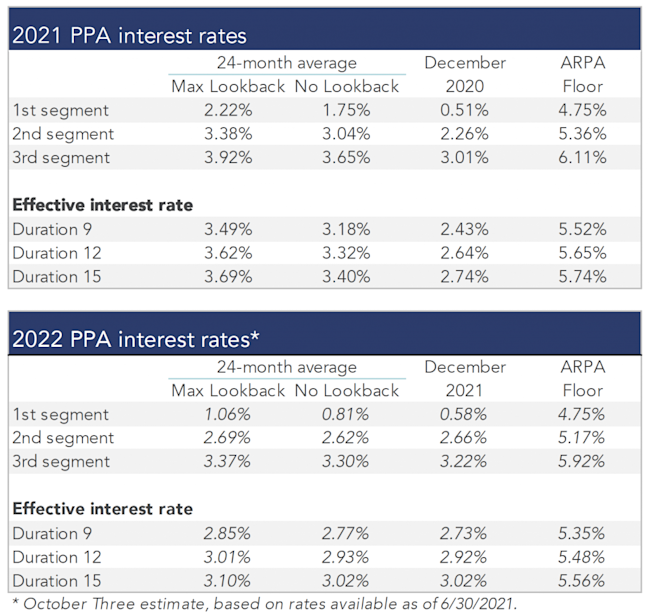The table below summarizes rates that plan sponsors are required to use for IRS funding purposes for 2021, along with estimates for 2022, reflecting the new law (ARPA). Pre-relief, both 24-month averages and December ‘spot’ rates, which are still required for some calculations, such as PBGC premiums, are also included.