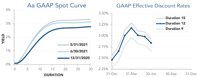 Pension liabilities (for funding, accounting, and de-risking purposes) are driven by market interest rates. The first graph below compares our Aa GAAP spot yield curve at December 31, 2020 and June 30, 2021, and it also shows the movement in the curve last month. The second graph below shows our estimate of movements in effective GAAP discount rates for pension obligations of various duration during 2021 so far: