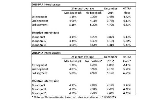 The table below summarizes rates that plan sponsors are required to use for IRS funding purposes for 2015, along with estimates for 2016. Pre-relief, both 24-month averages and December ‘spot’ rates, which are still required for some calculations, such as PBGC premiums, are also included.