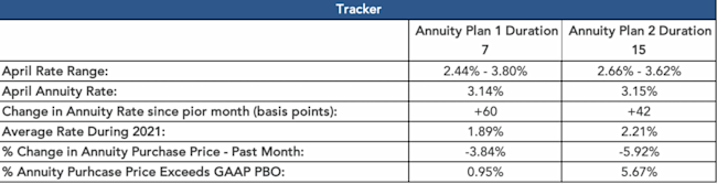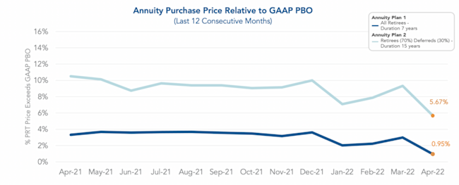 • The spread of annuity purchase prices above the GAAP projected benefit obligation (PBO) is the narrowest we have observed in the last 12 months, with Annuity Plan 1 at 0.95% and Annuity Plan 2 at 5.67%.