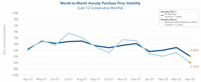 • Annuity Purchase Costs dropped significantly this month. The cost for Annuity Plan 1* and Annuity Plan 2* dipped roughly 4% and 6%, respectively.