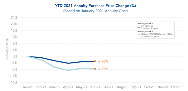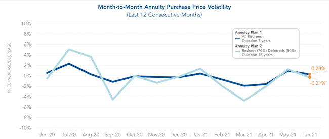 As mentioned in the May 2021 Pension Finance Update, pension plan funding statuses stayed level in May. The average duration 7 annuity purchase interest rates decreased 4 basis points and average duration 15 rates increased 2 basis point since last month as seen in the below graph titled Annuity Purchase Interest Rates.