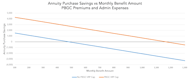 Annuity purchases for retirees with small benefit amounts can be an easy and highly effective way to reduce PBGC premiums and save money at no cost to plan participants. For plan sponsors not subject to the PBGC Variable Rate Premium Cap, purchasing annuities for retirees receiving less than $350 monthly will save the plan money. For plan sponsors subject to the cap, purchasing annuities for retirees receiving less than $1,050 monthly will save the plan money.