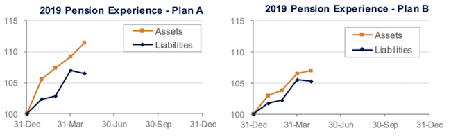 Interest rates have fallen about 0.4% this year, pushing pension liabilities higher, but stock market gains have outpaced this increase, producing net improvement in pension finances. The graphs below show the progress of assets and liabilities for our two model plans through the first four months of 2019: