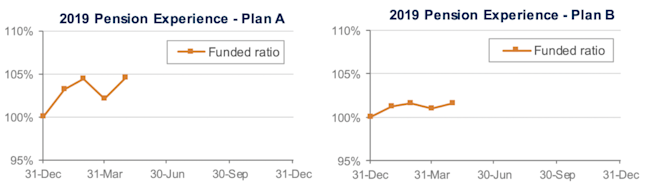 Pension finances bounced back in April due to higher stock prices and higher interest rates. Both model plans we track gained ground last month: Plan A added more than 2% and is now up almost 5% for the year, while Plan B gained close to 1% and is now up 2% through the first four months of 2019.