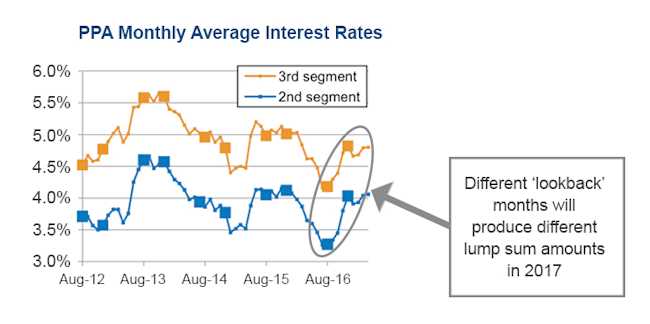 De-risking involves paying out the present value of a participant’s benefit as a lump sum. The interest rates used to calculate that present value are the Pension Protection Act (PPA) ‘spot’ first, second and third segment rates for a designated month. Sponsors typically set the lump sum rate at the beginning of the plan year, based on a lookback month defined in the plan (August through December for calendar-year plans), so they will know what rate will be used to calculate their lump sum for the entire year.