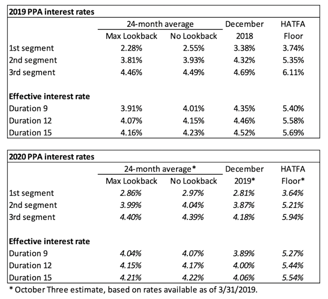 The table below summarizes rates that plan sponsors are required to use for IRS funding purposes for 2019, along with estimates for 2020. Pre-relief, both 24-month averages and December ‘spot’ rates, which are still required for some calculations, such as PBGC premiums, are also included.