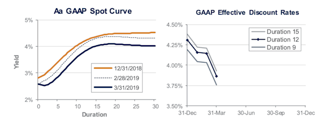 Pension liabilities (for funding, accounting, and de-risking purposes) are driven by market interest rates. The graph on the left compares our Aa GAAP spot yield curve at December 31, 2018, and March 31, 2019, and it also shows the movement in the curve last month. The graph on the right shows our estimate of movements in effective GAAP discount rates for pension obligations of various duration during 2019: