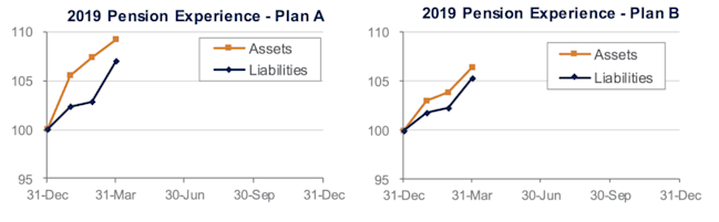 Interest rates, which moved higher during most of 2018, have fallen sharply this year. This movement has pushed up pension liabilities, negating much of the benefit of higher stock prices in 2019, although pension plans remain modestly in the black so far this year. The graphs below show the progress of assets and liabilities for our two model plans this year: