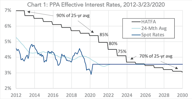 As this chart shows, market (spot) interest rates are (at current very volatile rates) projected to be higher than HATFA rates beginning around 2026. That’s worse than the situation at the beginning of 2019, when market interest rates were projected to be higher than HATFA rates beginning as early as 2023. This change will result in lower asset valuation rates (and higher valuations) beginning in 2023. But it is better than the situation a week ago, when lower HATFA valuation rates were projected to last for the foreseeable future. Now we’re projecting that market rates will exceed HATFA rates by 2025 or 2026.