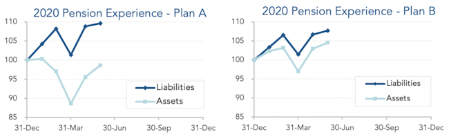 No one could have predicted 2020 thus far: the COVID-19 pandemic threw a monkey wrench into the global economy, and now the USA is suffering through a huge eruption of domestic protests and chaos. Yet, since the end of March, stocks have regained a lot of lost ground and pension finances have clawed back some of the first quarter losses. The graphs below show the movement of assets and liabilities during the first five months of 2020: