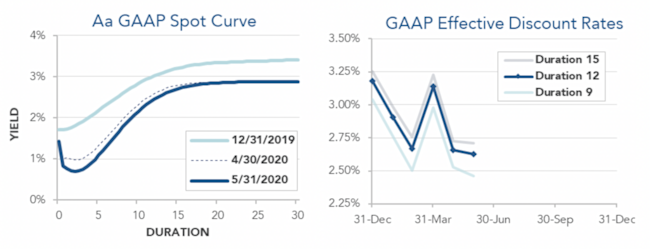 Pension liabilities (for funding, accounting, and de-risking purposes) are driven by market interest rates. The first graph below compares our Aa GAAP spot yield curve at December 31, 2019 and May 31, 2020, and it also shows the movement in the curve last month. The second graph below shows our estimate of movements in effective GAAP discount rates for pension obligations of various duration during 2020: