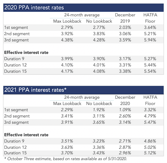 The table below summarizes rates that plan sponsors are required to use for IRS funding purposes for 2020, along with estimates for 2021. Pre-relief, both 24-month averages and December ‘spot’ rates, which are still required for some calculations, such as PBGC premiums, are also included.