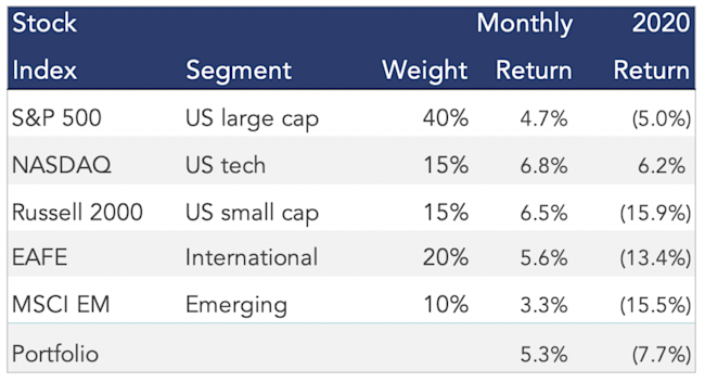 Overall, our traditional 60/40 portfolio gained 3% in May but remains down more than 1% for the year, while the conservative 20/80 gained almost 2% last month and is now up more than 4% through the first five months of 2020.