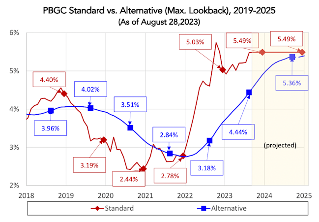 As we discussed in detail in March (Reducing PBGC premiums in 2023 – the significance of the standard/alternative method election), for many plans, the amount of PBGC variable-rate premiums the plan will owe this year depends on whether the plan can use the standard (spot-rate) method, rather than the alternative (24-month average) method, to value PBGC “unfunded vested benefit” (UVB) liabilities. An election to change from the alternative method to the standard method generally must be made (for calendar year plans) by October 16, 2023. Because of the 5-year lock-up rule (see below), plans that elected the alternative method in 2019 or later may not elect to switch to the standard method for 2023.
