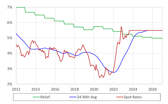 The chart below shows the interplay between market interest rates (red line), 24-month average rates (blue line), and 25-year average funding relief rates (green line) up to now, projected through the end of 2026 assuming no future change in rates.