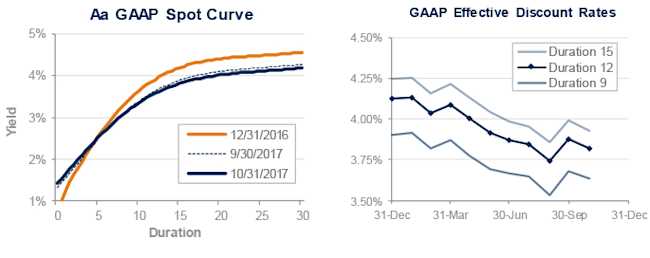 Pension liabilities (for funding, accounting, and de-risking purposes) are now driven by market interest rates. The graph on the left compares our Aa GAAP spot yield curve at December 31, 2016, and October 31, 2017, and it also shows the movement in the curve last month. The graph on the right shows our estimate of movements in effective GAAP discount rates for pension obligations of various durations during 2017: