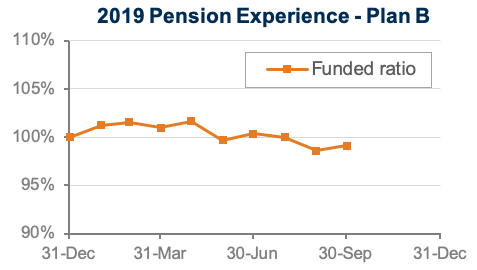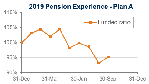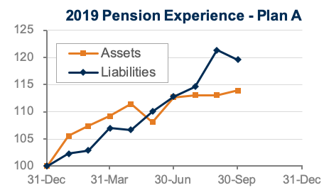 Through the first three quarters of 2019, pension sponsors have seen strong asset growth but even stronger liability growth, as interest rates continue to flirt with all-time lows. The graphs below show the progress of assets and liabilities for our two model plans through September this year: