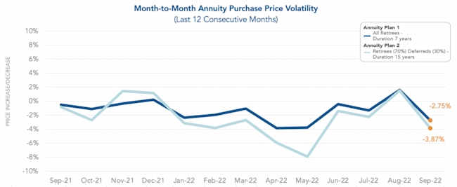 Annuity purchase cost can alter from month to month. Although the annuity purchase cost for both plans increased last month, we have seen a general downward trend in cost in 2022. Since last month, The purchase price for Annuity Plan 1 decreased 2.75% and Annuity Plan 2 decreased 3.87%. An early entrance to the insurance market is a vital component of the planning stage because of the consistent short-term volatility of annuity pricing. By connecting with an annuity search firm early on, plan sponsors can capitalize on favorable fluctuations in a volatile market.