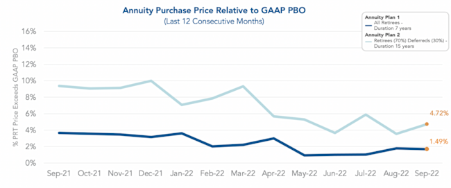 The graph below displays the difference between annuity purchase price above GAAP projected benefit obligation (PBO). We refer to GAAP PBO and accounting book value interchangeably. In September 2022, the spread for Annuity Plan 1 slightly decreased to 1.49% and increased to 4.72% for Annuity Plan 2. The spread for both plans remains lower than the observed average. An increase in annuity purchase rates inversely lowers annuity purchase prices relative to accounting book value. Please note, that the below PBO calculations exclude future overhead costs paid by plan sponsors to retain participants in the plan. Administrative expenses and PBGC premiums are examples of these overhead costs. Future overhead costs would narrow the spread, though the extent is plan specific.