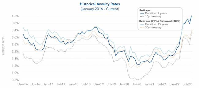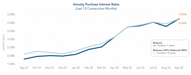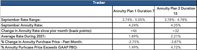 • The average Annuity Purchase Interest rates jumped this past month, with the average duration 7 rate at 4.24% and average duration 15 rate at 4.25%.