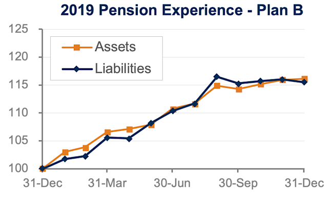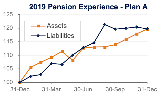 Corporate bond yields moved up more than 0.05% in December. As a result, pension liabilities fell almost 1% during the month, ending 2019 14%-23% higher, with long duration plans seeing the largest increases.