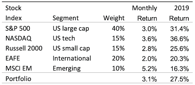 Overall, our traditional 60/40 portfolio gained more than 1% during December and 20% for the year, while the conservative 20/80 portfolio was flat last month but earned 16% overall in 2019.