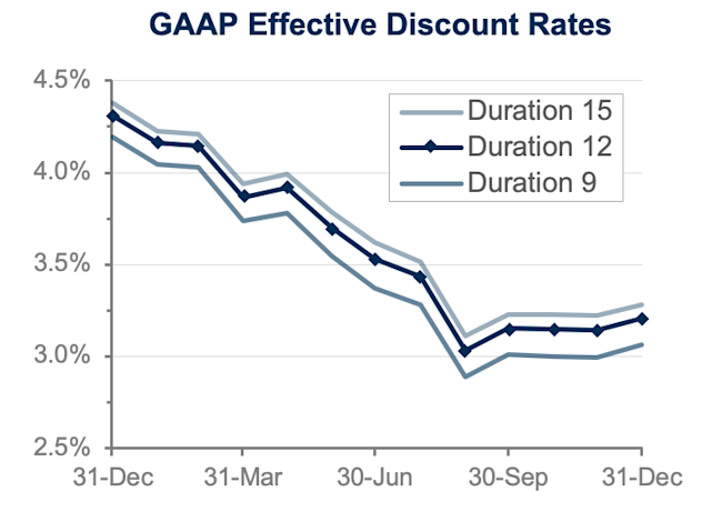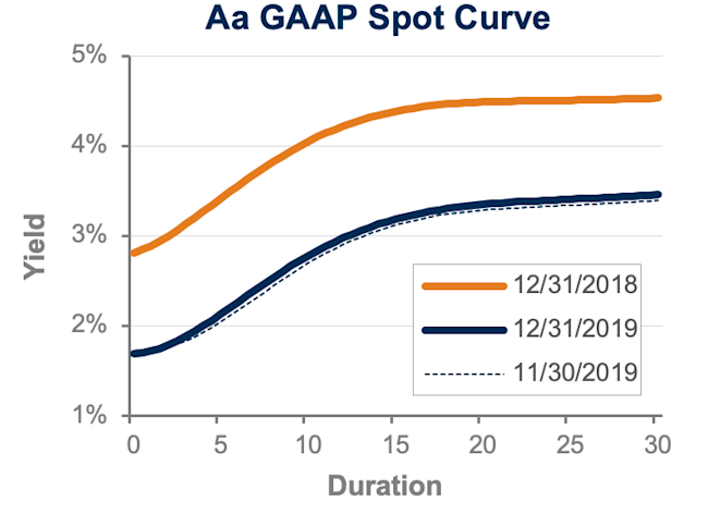 Pension liabilities (for funding, accounting, and de-risking purposes) are driven by market interest rates. The first graph below compares our Aa GAAP spot yield curve at December 31, 2018 and December 31, 2019, and it also shows the (small) movement in the curve last month. The second graph below shows our estimate of movements in effective GAAP discount rates for pension obligations of various duration during 2019: