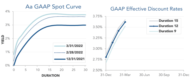 Pension liabilities (for funding, accounting, and de-risking purposes) are driven by market interest rates. The first graph below compares our Aa GAAP spot yield curve at December 31, 2021 and March 31, 2022, and it also shows the movement in the curve last month. The second graph below shows the dramatic increase in effective GAAP discount rates for pension obligations of various duration so far during 2022: