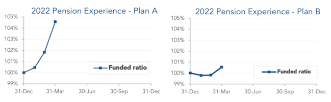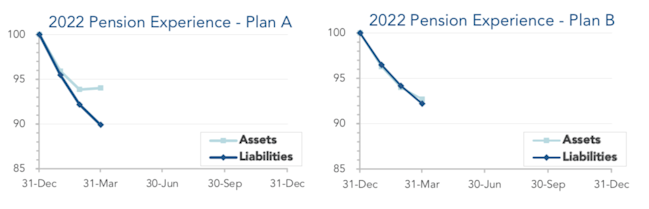 Overall, pensions enjoyed a strong quarter. Coming on top of a strong 2021, most pension sponsors are looking at significantly better funded plans than fifteen months ago. The graphs below show the movement of assets and liabilities during the first quarter of 2022: