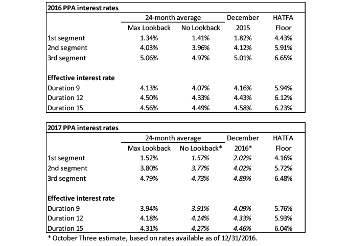 The table below summarizes rates that plan sponsors are required to use for IRS funding purposes for 2016, along with estimates for 2017. Pre-relief, both 24-month averages and December ‘spot’ rates, which are still required for some calculations, such as PBGC premiums, are also included.