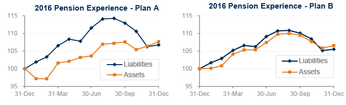 For pension finance, the story of 2016 can read two different ways. If you fell asleep at the end of 2015 and just woke up today, it looks like a ho-hum year, in which both assets and liabilities grew by single digits, with asset growth slightly edging out liability increases. But if you followed daily market movements, 2016 was a harrowing ride, which saw funded status decline by 7% in the first half of the year before improving 8% in the second half. For the $2 trillion pension market in the US, this amounts to a loss of about $150 billion through June that was completely erased by year-end. Given that total corporate profits of US companies are about $1.5 trillion, and that many leading companies no longer sponsor pension plans, these are prodigious swings.