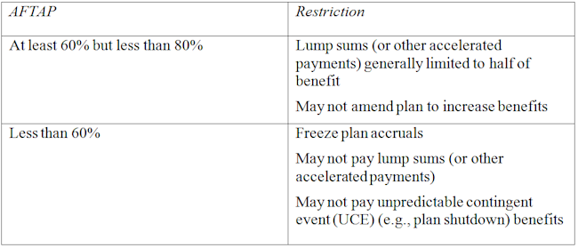 3. Plans that had a 2011 AFTAP of 70-79%: Benefit restrictions applicable in 2011 continue to apply. When the 2012 actuarial certification is made, if the plan’s AFTAP is 80% or higher, restrictions will stop.