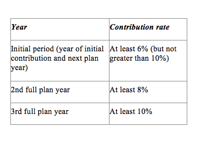SAFE also would add a new automatic contribution/automatic increase safe harbor that is essentially the same as the one in the Neal bill. It would use higher default contribution rates, as summarized in the following table.