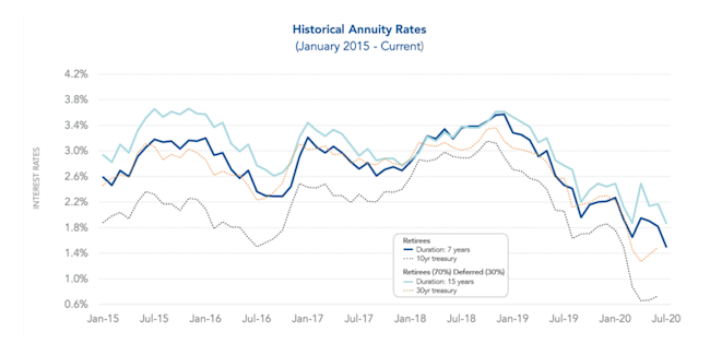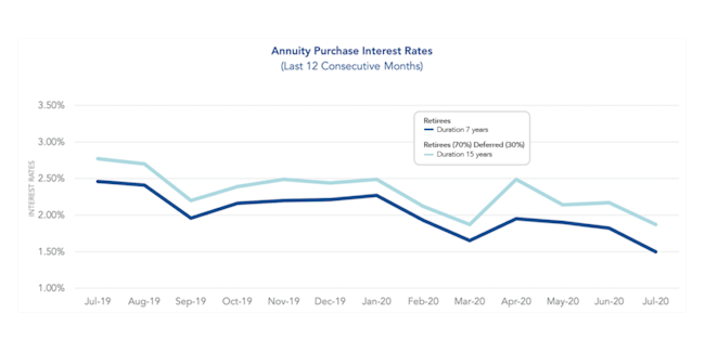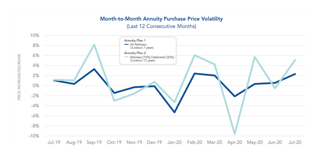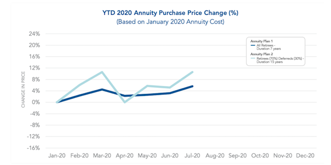 As mentioned in our June 2020 Pension Finance Update, pension plans gained ground last month. The strong equity market returns of 2019 were set back by poor performance in the first quarter of 2020, but Q2 2020 gains reversed the downward 2020 trend. The average duration 7 annuity purchase interest rates decreased by 32 basis points and average duration 15 rates decreased by 30 basis points since last month. This change in rates led to a corresponding increase in annuity purchase price of 5.64% for Annuity Plan 1 and a 10.48% increase for Annuity Plan 2.
