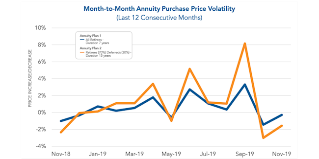 The spread of annuity purchase prices above the GAAP projected benefit obligation (PBO) remained fairly stable during 2018. This spread was around 4% for Annuity Plan 1 and 12% for Annuity Plan 2. When annuity purchase interest rates and yield curve interest rates changed rapidly in December 2018 and throughout 2019, the spread fluctuated slightly up and down for both plans. From October 2019 to November 2019, the spread decreased less than 1%.