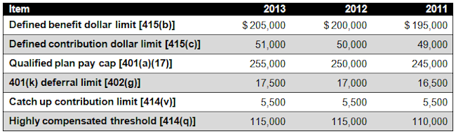 The release of September CPI figures by the Bureau of Labor Statistics also provides information needed to determine relevant 2013 thresholds and limits for retirement plans. Between the third quarter of 2011 and the third quarter of 2012, CPI-U increased 1.70%. Ahead of the official release by IRS, we have summarized the 2013 limits for various purposes below, along with values for 2011 and 2012: