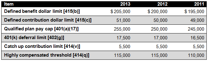 The release of September CPI figures by the Bureau of Labor Statistics also provides information needed to determine relevant 2013 thresholds and limits for retirement plans. Between the third quarter of 2011 and the third quarter of 2012, CPI-U increased 1.70%. Ahead of the official release by IRS, we have summarized the 2013 limits for various purposes below, along with values for 2011 and 2012: