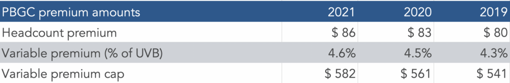 The increase in national average wages also drives some key amounts used in calculating PBGC premiums. Relevant amounts for 2021 (along with 2020 and 2019) are summarized below: