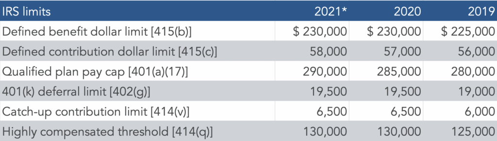 IRS will soon release limits applicable to retirement plans for various purposes in 2021, based on a 1.22% increase in CPI-U between the 3rd quarter of 2019 and the 3rd quarter of 2020. Based on this increase, we expect increases in most limits applicable to retirement plans in 2020. The table below summarizes our calculations for 2021, along with values for 2020 and 2019: