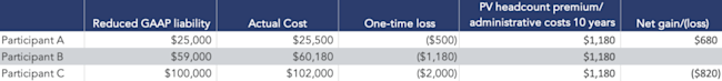 These numbers would (obviously) change as the key factors – e.g., carrier premium-over-book, discount rate, and assumed increase in future costs – change.