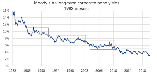 Chart 1 maps yields on long-term corporate bonds since 1982: