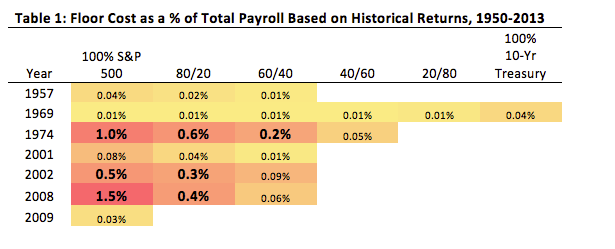 For a generic 60/40 portfolio, employers have experienced one material floor risk in the past 63 years – 1974, which cost 0.2% of total payroll for our 5% of pay plan.