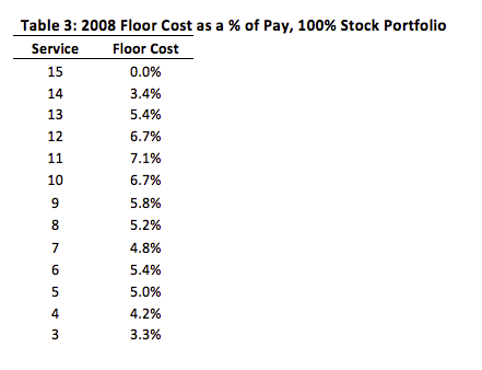 Now, unless all employees are hired at the beginning of 1998 and all employees terminate at the end of 2008, the total cost as a percent of total payroll will be much less than this. Table 3 summarizes the 2008 floor cost under the 100% stock portfolio for all employees with between 3 and 15 years of service: