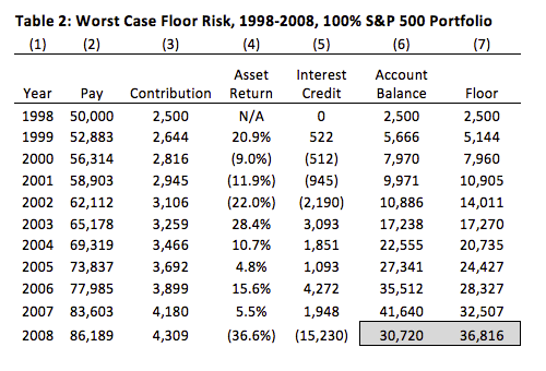 From Table 1, the ‘worst case’ outcome (1.5% of total payroll) was in 2008 under a 100% stock portfolio. All employees terminating with between 3 and 14 years of service in this scenario produced floor events, with the largest cost registering for an employee with 11 years of service (7.1% of pay.)